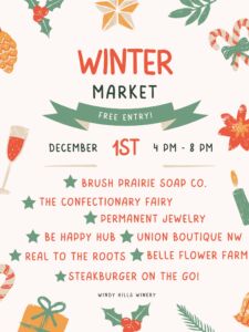 Join us for our annual Winter Market from 4-8! Get in the holiday spirit by finding some gifts from local vendors and enjoying some delicious drinks at the same time! FREE entry, all ages welcome, drinks will be available for purchase from Windy Hills Winery. Food will be available for purchase from Steak Burger on...